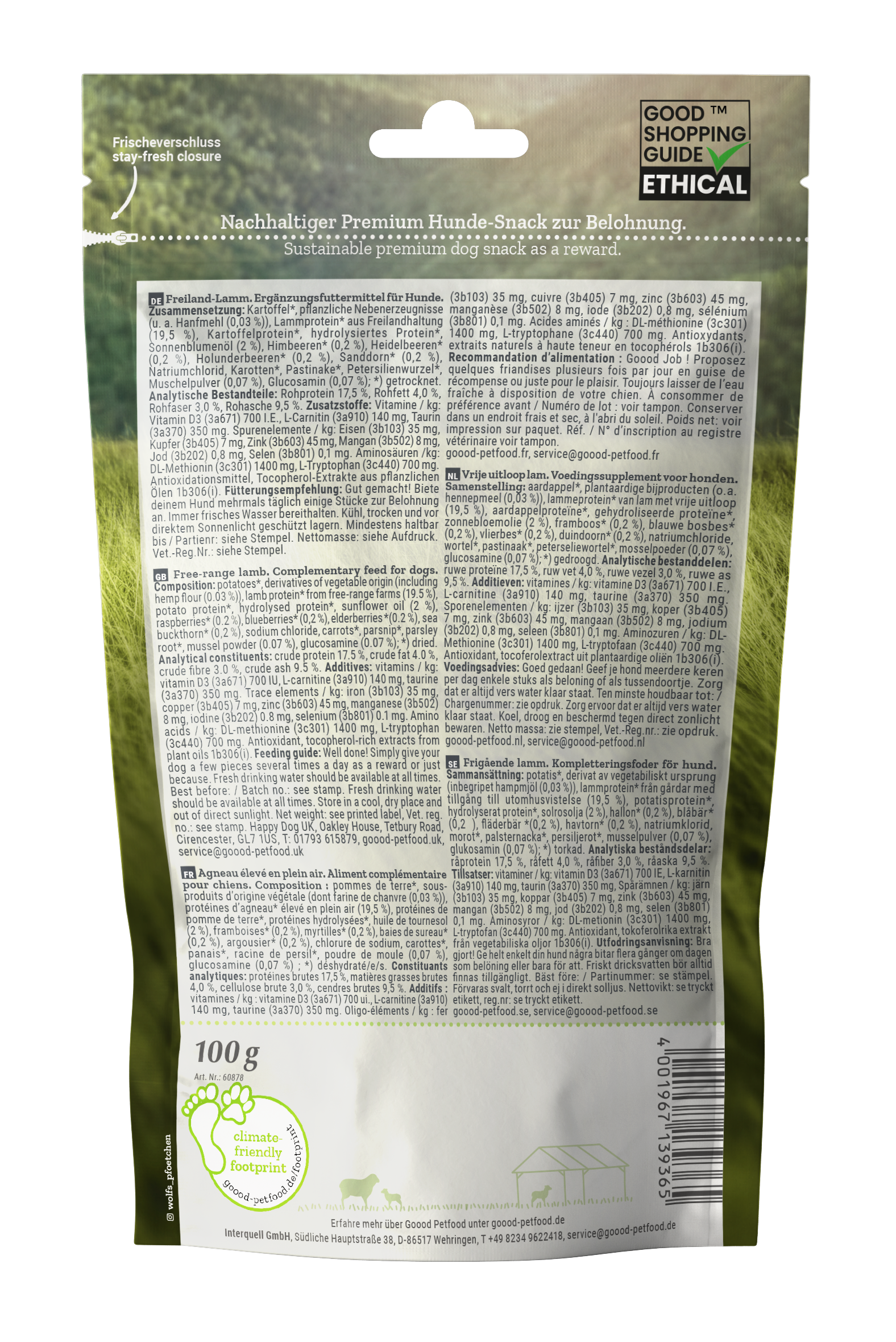 Our lamb comes from controlled free-range husbandry. The sheep and lambs can enjoy the fresh air and graze all year round. This is one of the reasons why our Soft Gooodies taste so juicy. The natural recipe for our dog treats does not contain sugar or artificial colours, flavours or preservatives and is also tasty for sensitive dog stomachs. Instead, we mix the valuable green-lipped mussel, which is good for bones and joints.