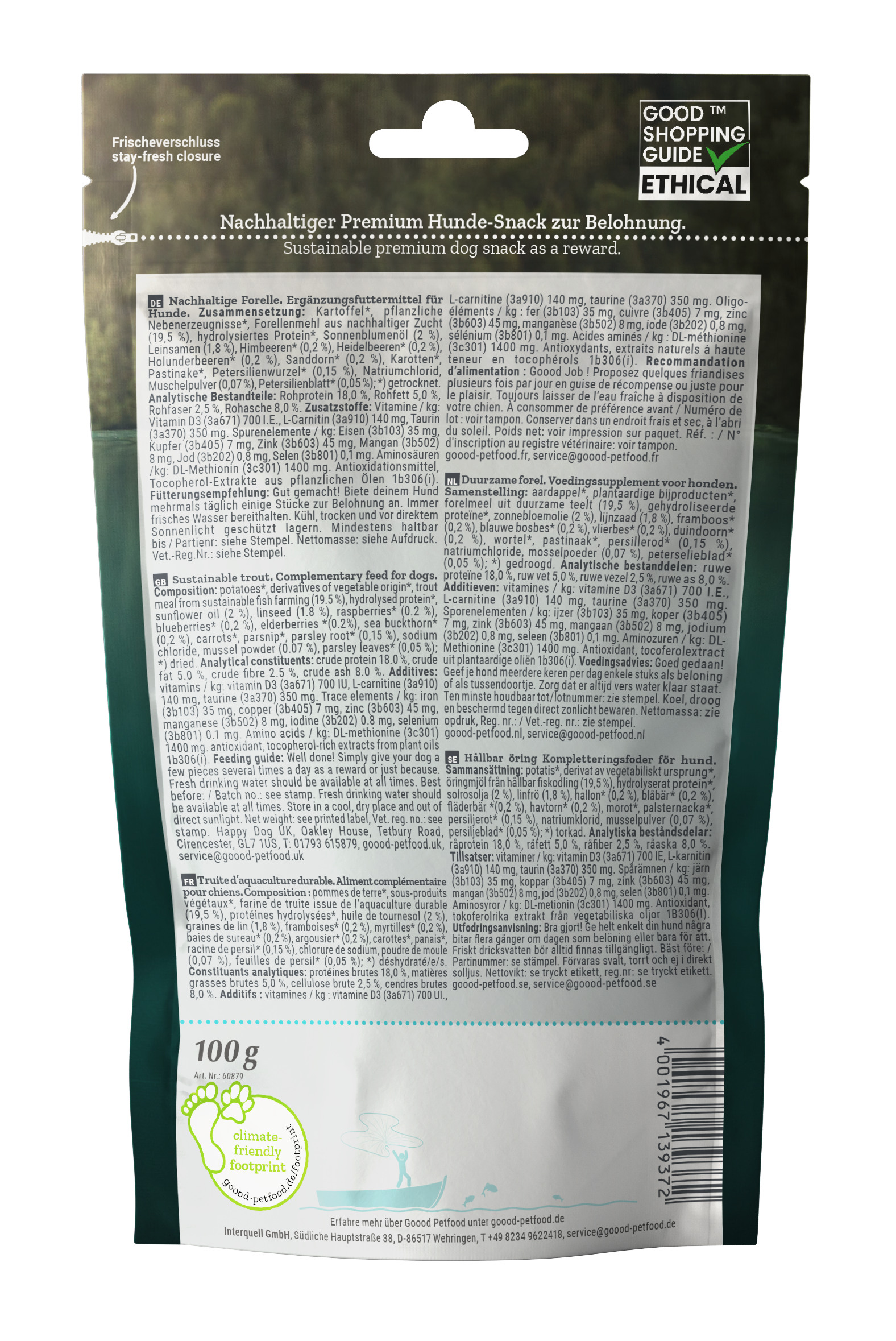 Soft gooodies are soft and juicy, easily digestible and good for skin and fur. Our trout come from species-appropriate, sustainable aquaculture. They contain a lot of protein and provide energy for in between meals. Our recipe does not need any added sugar or artificial colours, flavours or preservatives and is also tasty for dogs with sensitive stomachs and food intolerances.
