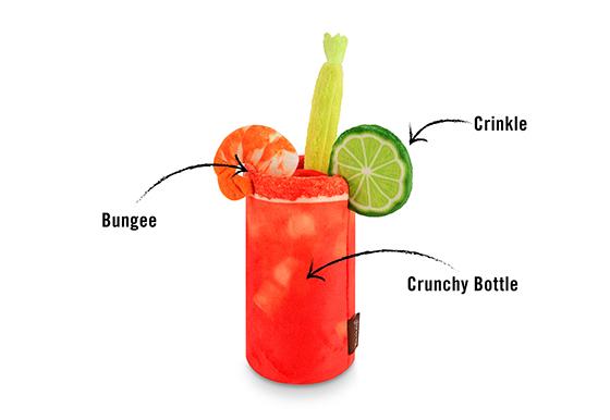 Cheers to a tasty meal with this play on a classic Buddy Mary! Featuring a crunchy center, crinkly lime and a bungee shrimp, this toy is full of surprises and will quickly become your pup’s go to beverage.