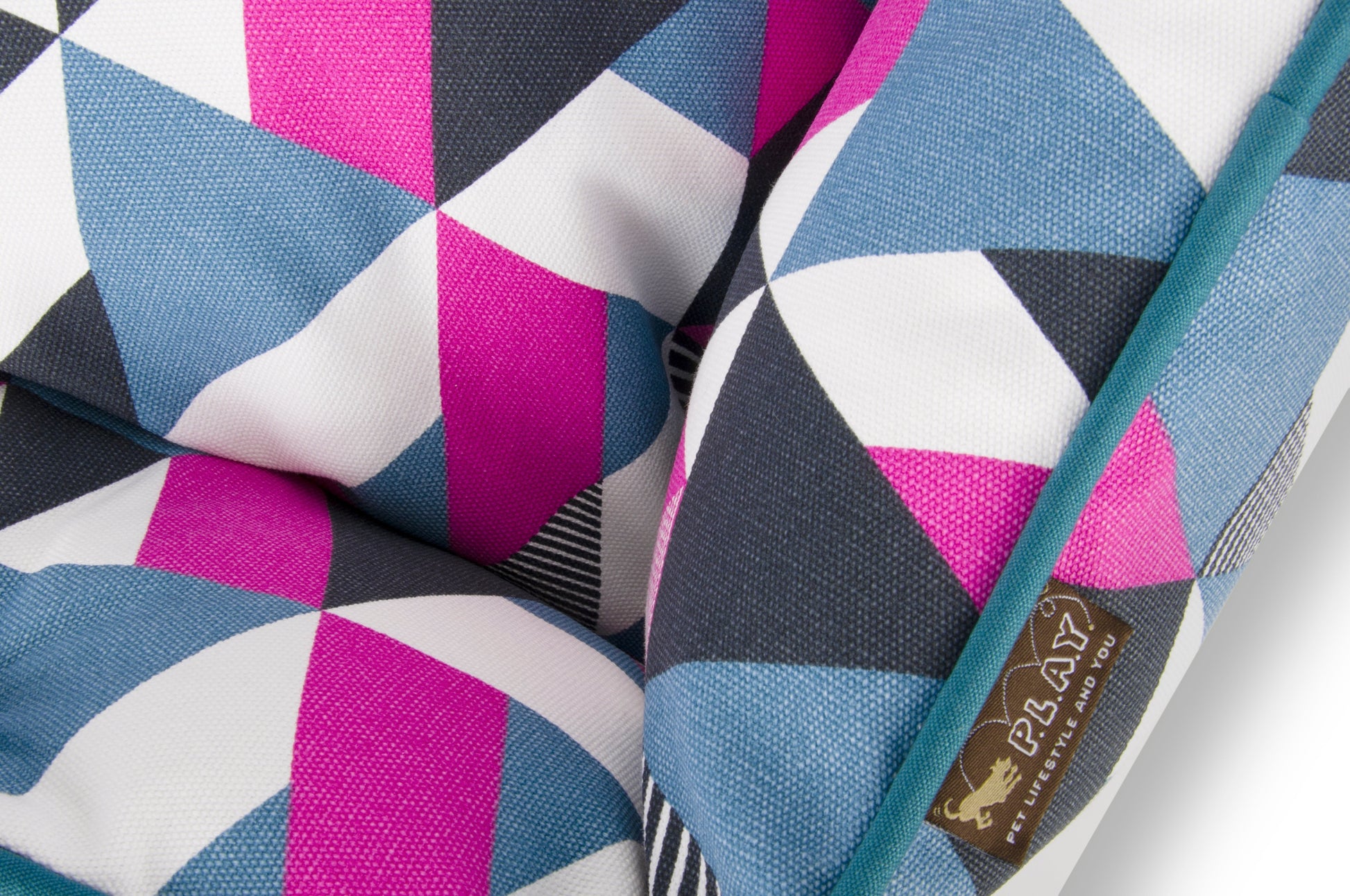 P.L.A.Y.’s Mosaic Soda Pop Lounge Bed is made from 100% natural unique cotton fabric keeping  your pup lounging in style all night long.