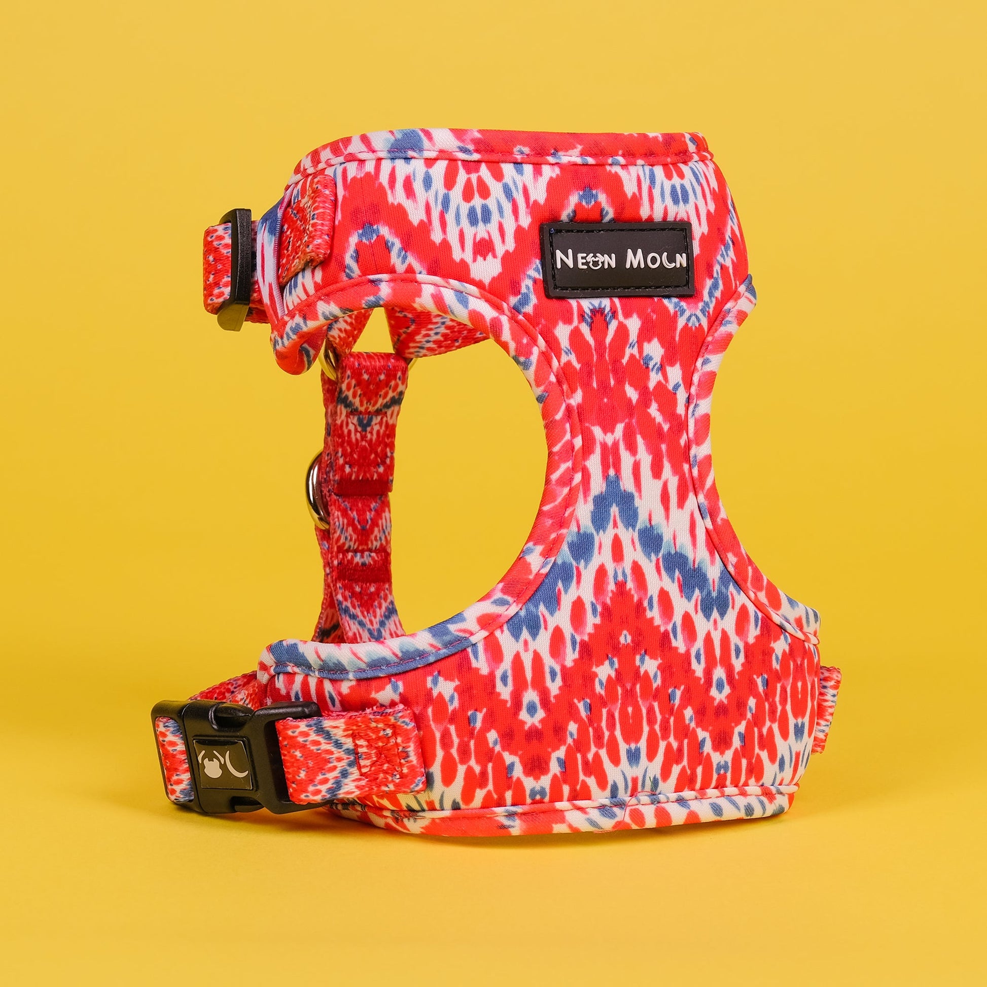 A vibrant blend of style and comfort for your beloved pet! With its red and blue chevron pattern, inspired by the beach, you cannot be missed in this bold harness.