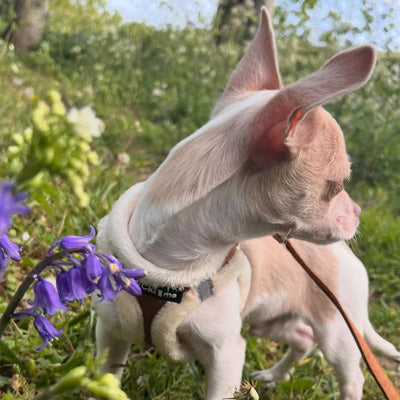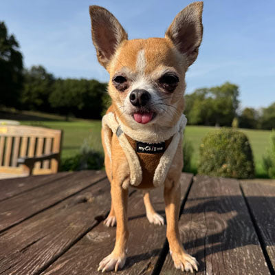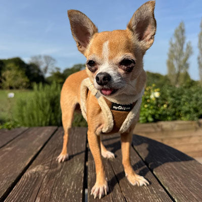 Each harness is finished with a black rubber My Chi and Me branding patch on the chest and the My Chi and Me branding on the acrylic buckle for that quality finishing touch.